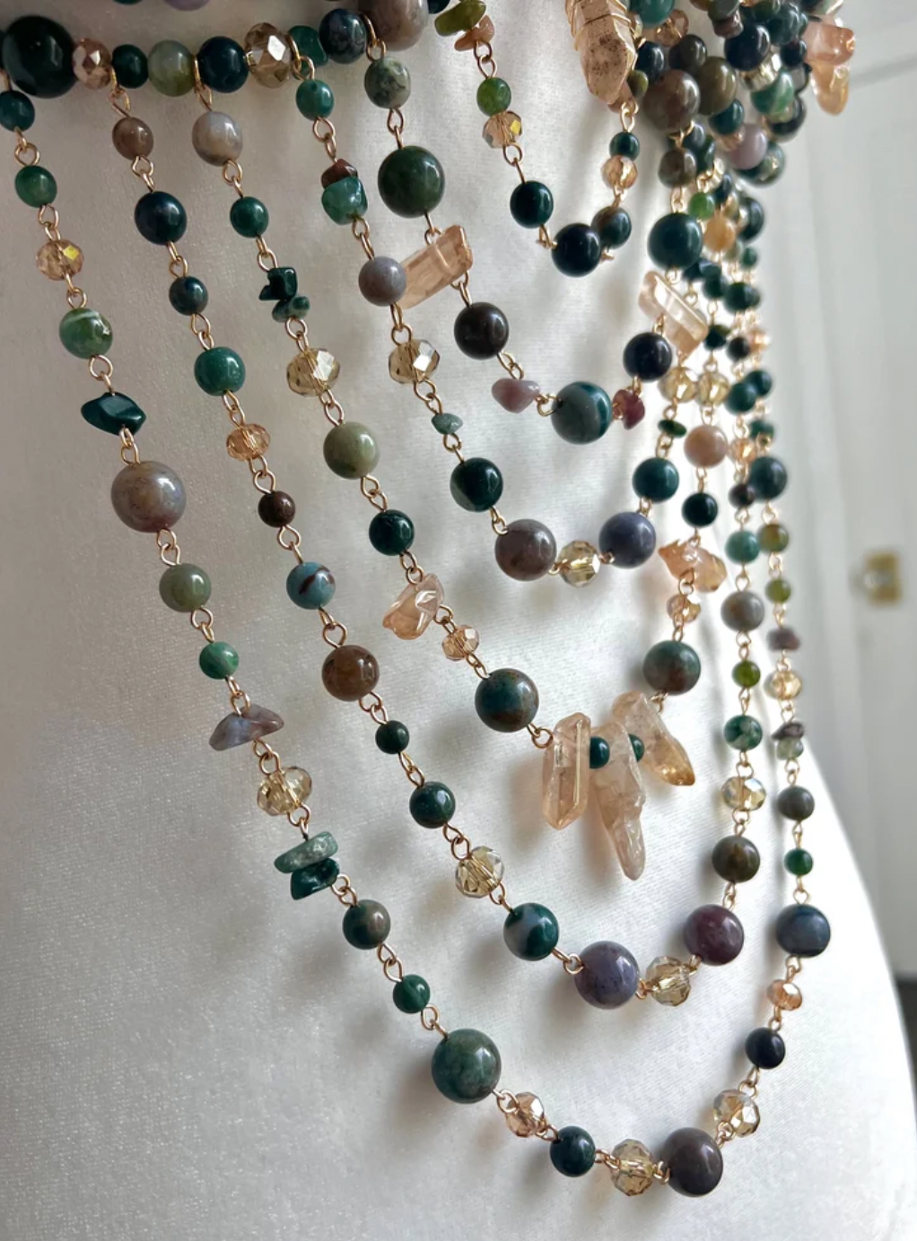 The Esmeralda beaded bralette is handmade using 14K Gold Vermiel, Citrine Points, Mixed Agate, and Swarovski Crystals. A care sheet with instructions will come with your bralette.