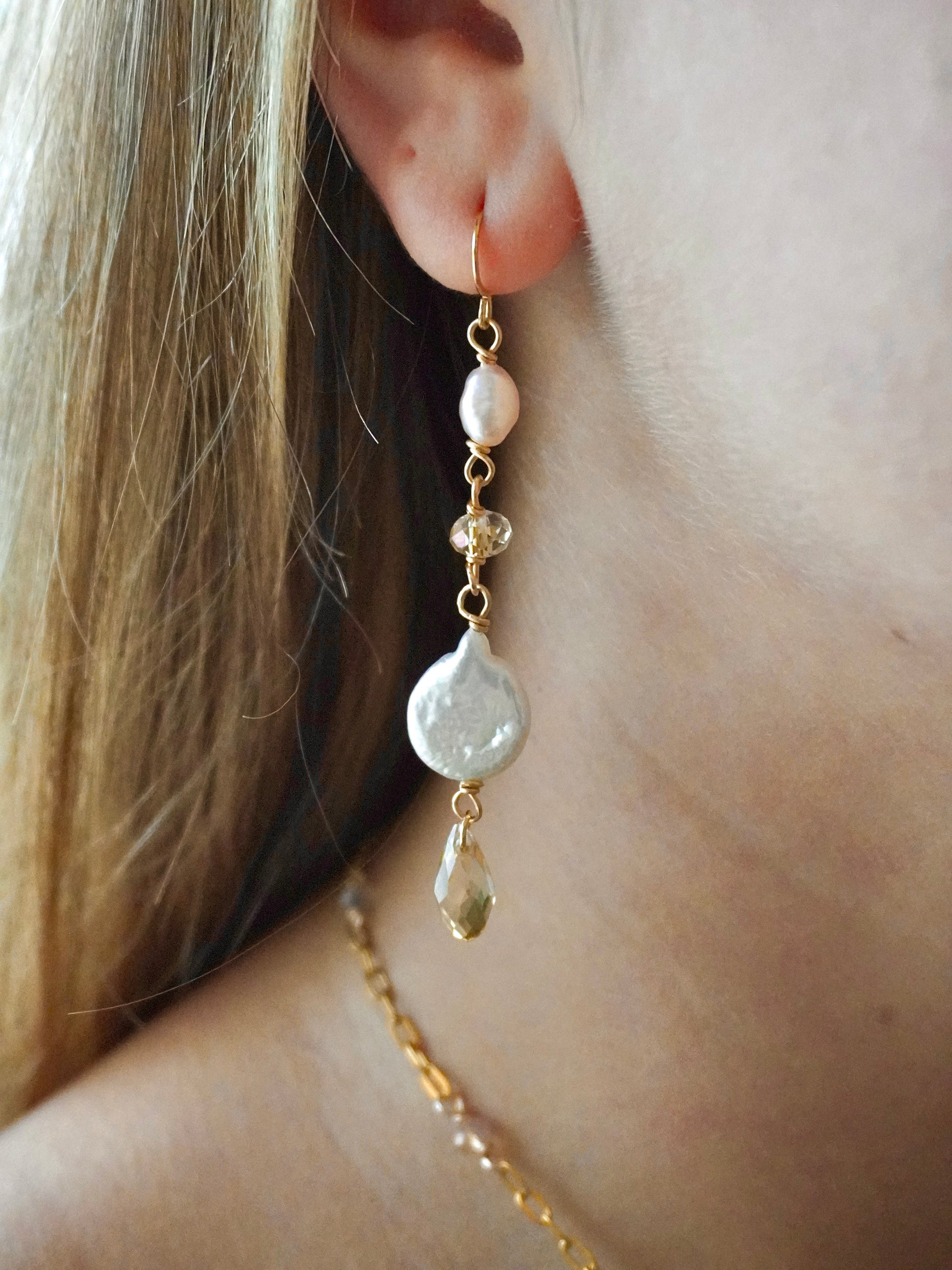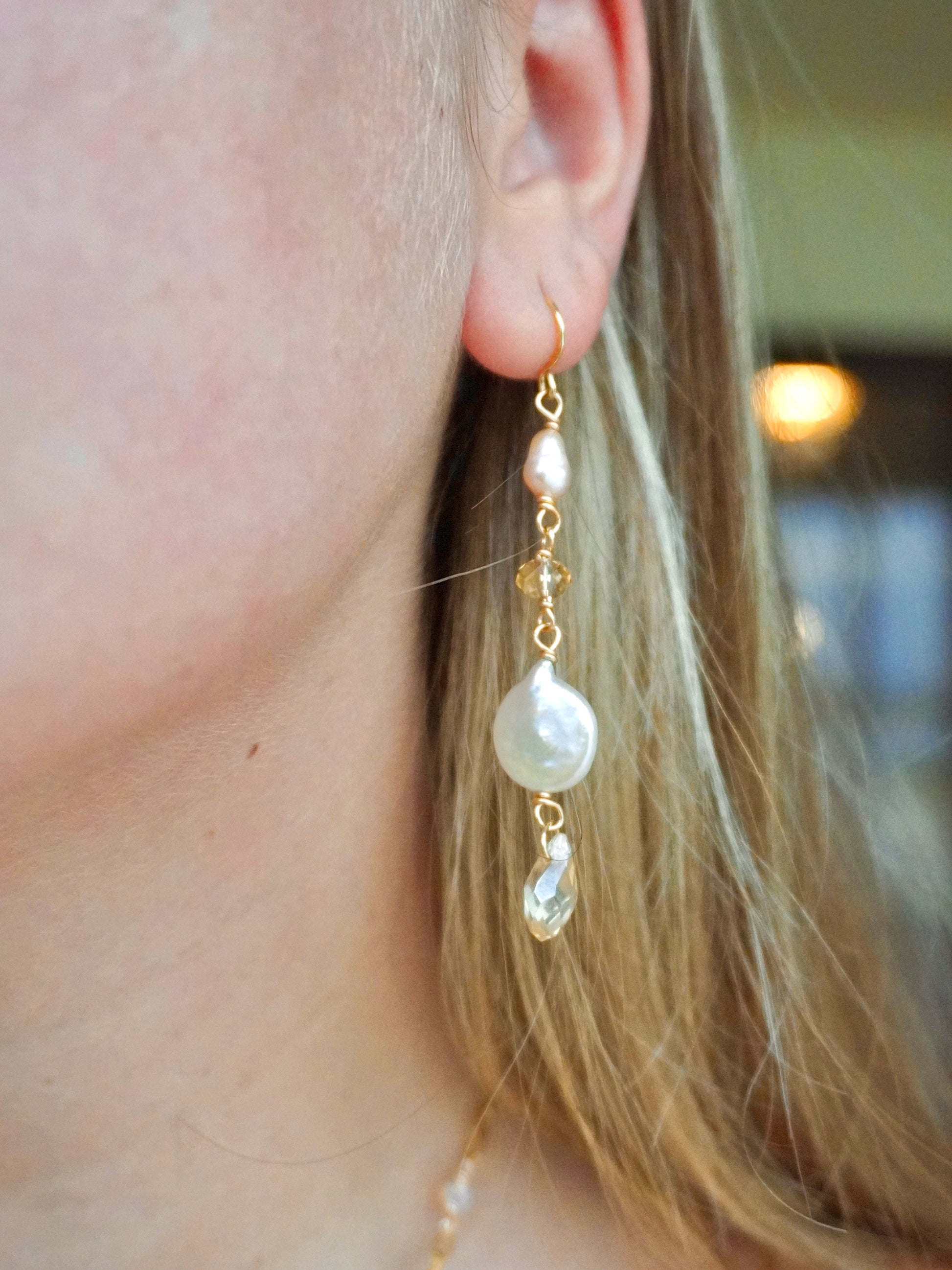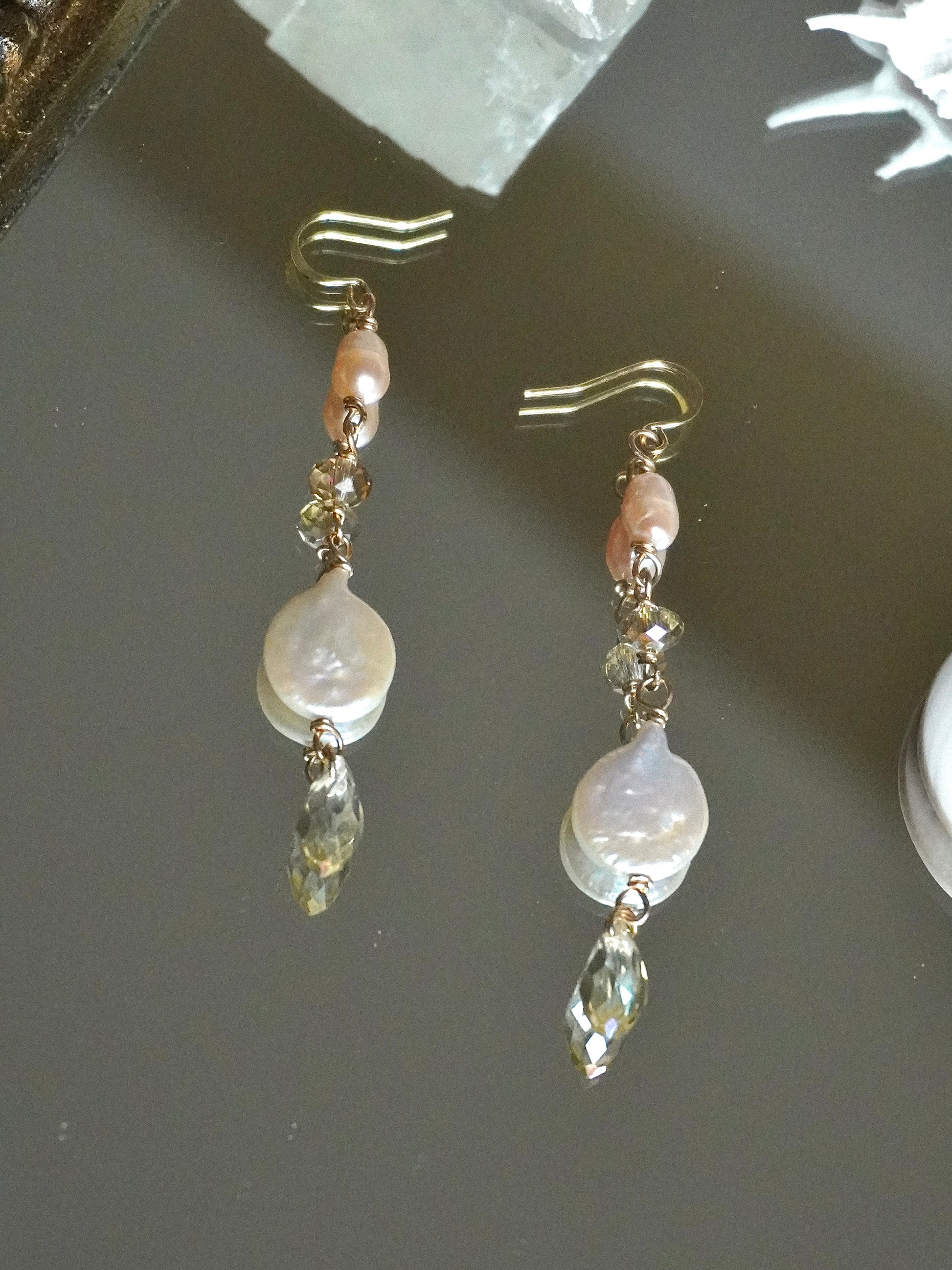 Enchanted with the intention of perseverance and attraction. The earrings includes teardrop freshwater pearl, Czech beads and moonstone crystals. Wrapped with 14k Gold Vermeil or Sterling Silver wire.
