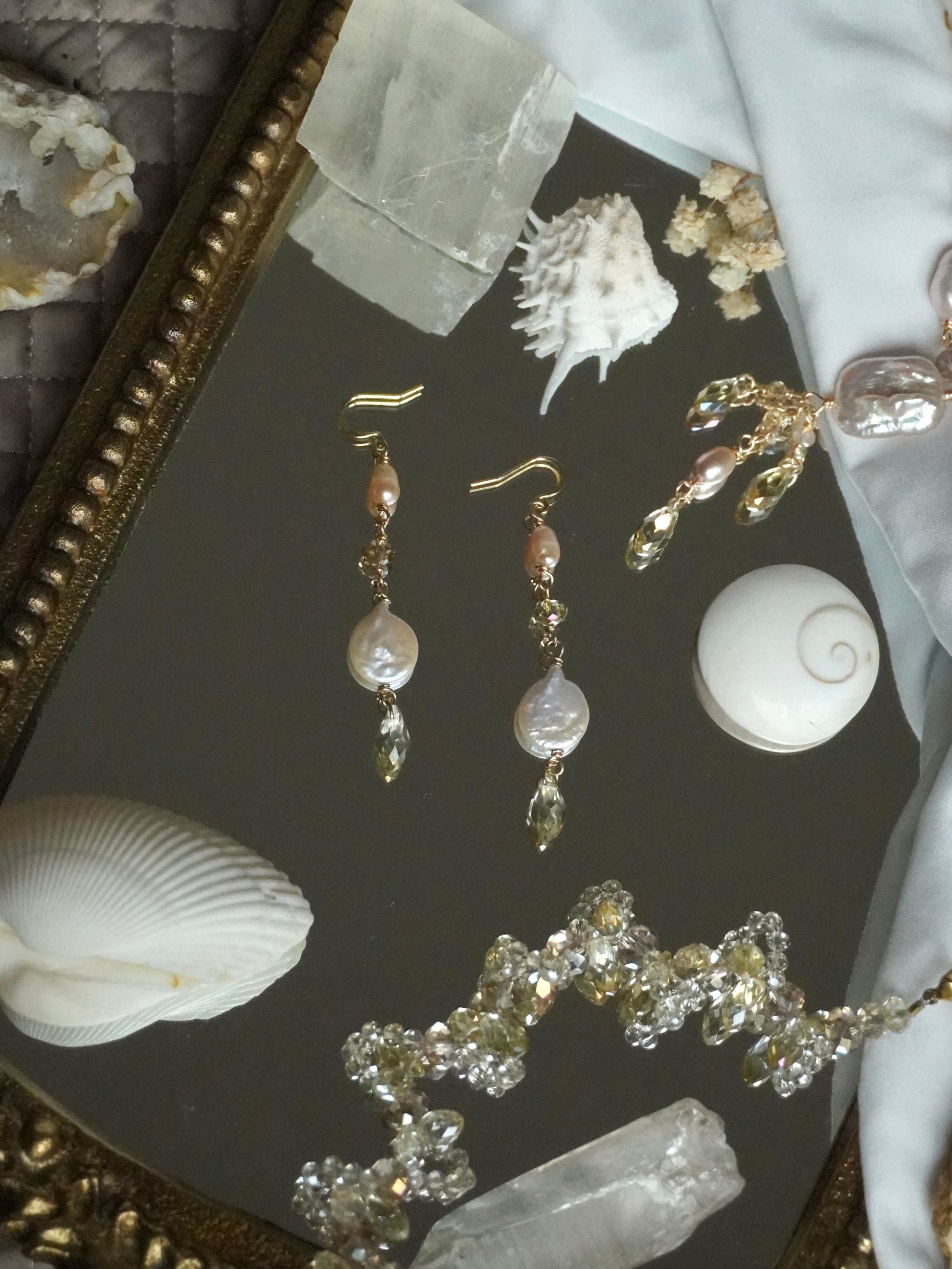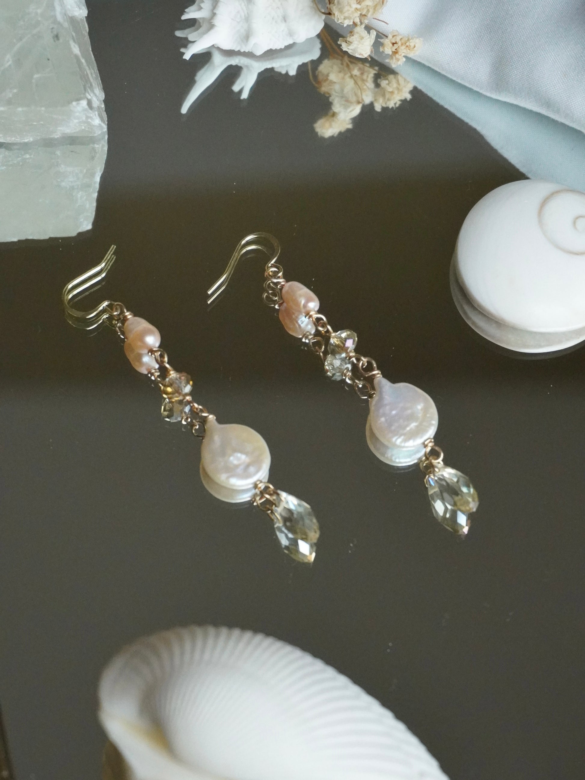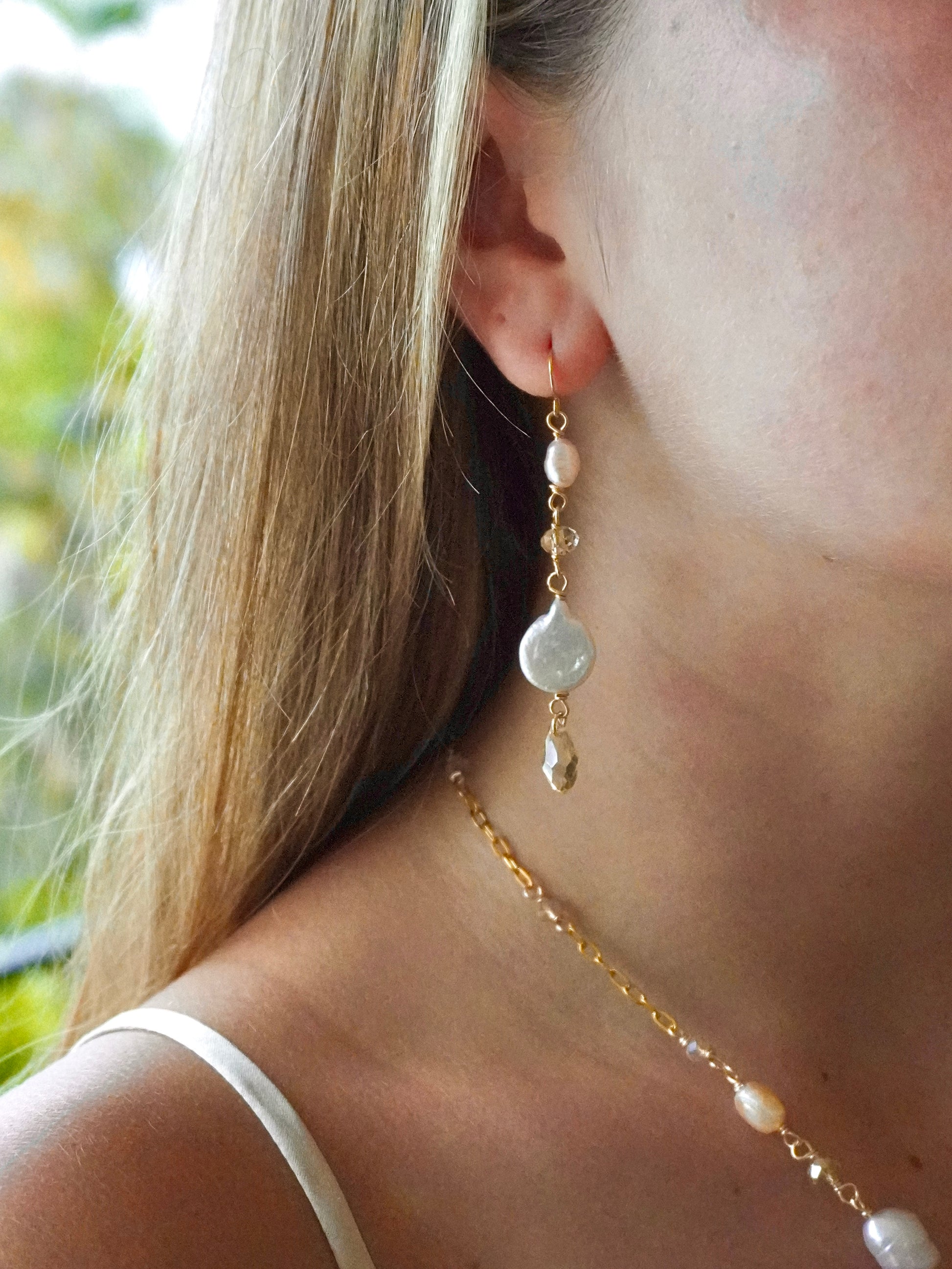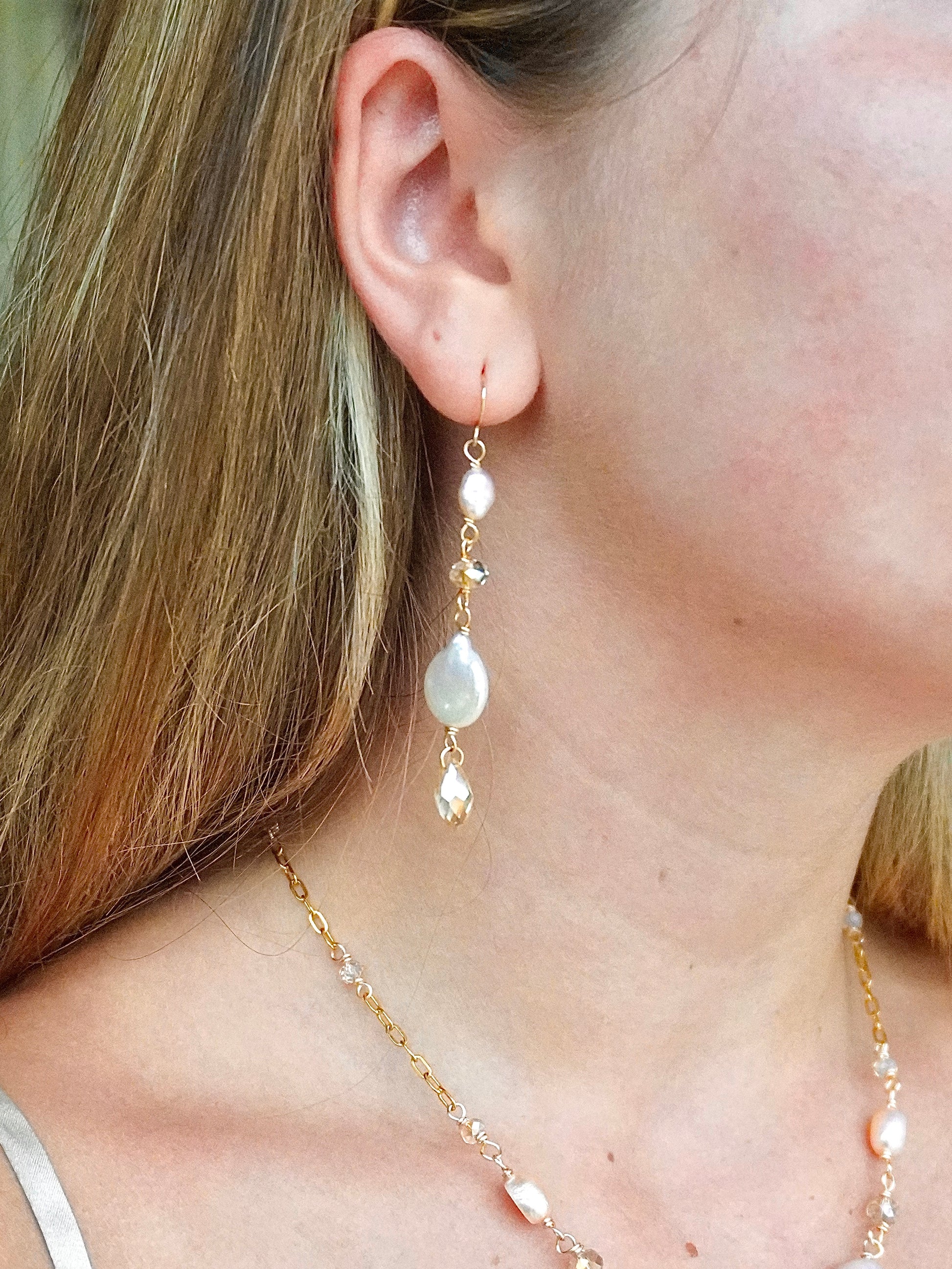 Enchanted with the intention of perseverance and attraction. The earrings includes teardrop freshwater pearl, Czech beads and moonstone crystals. Wrapped with 14k Gold Vermeil or Sterling Silver wire.