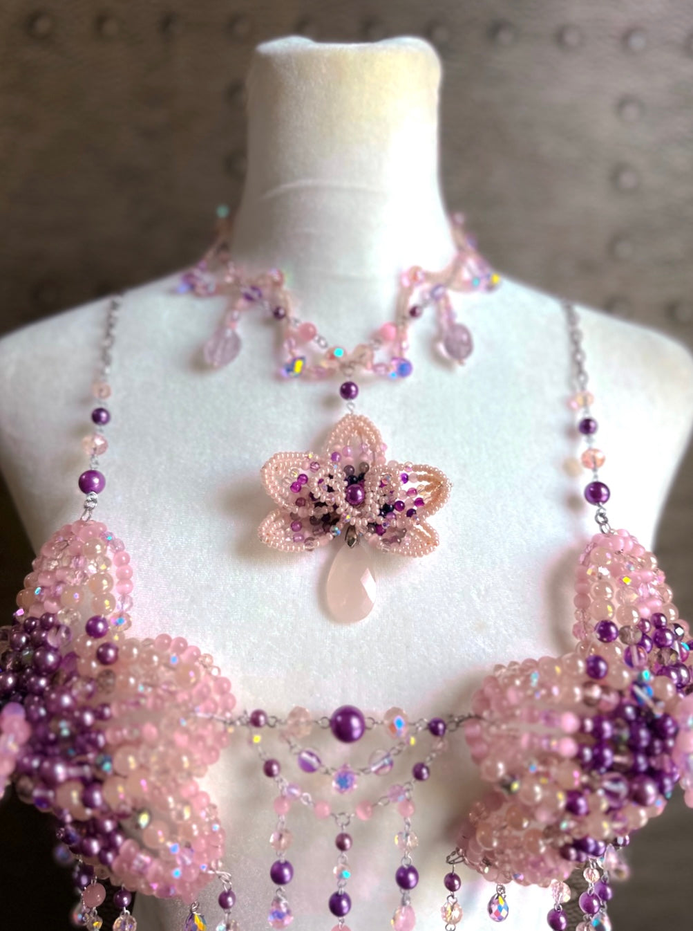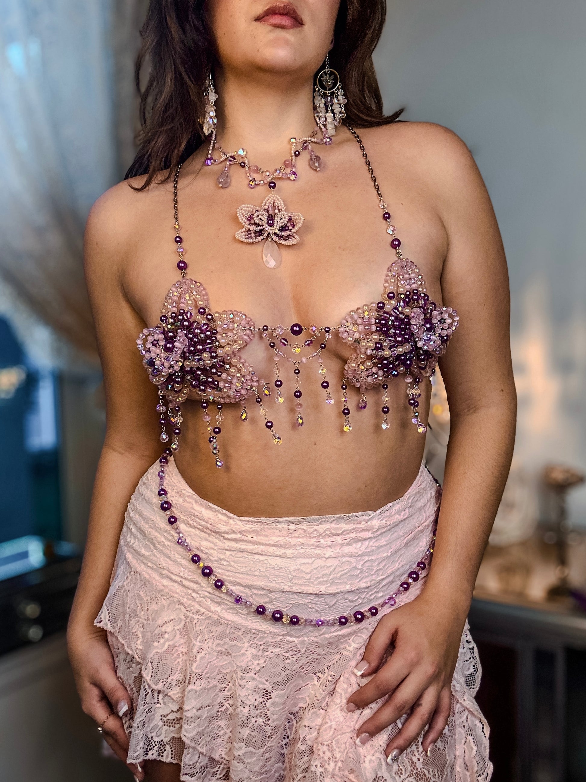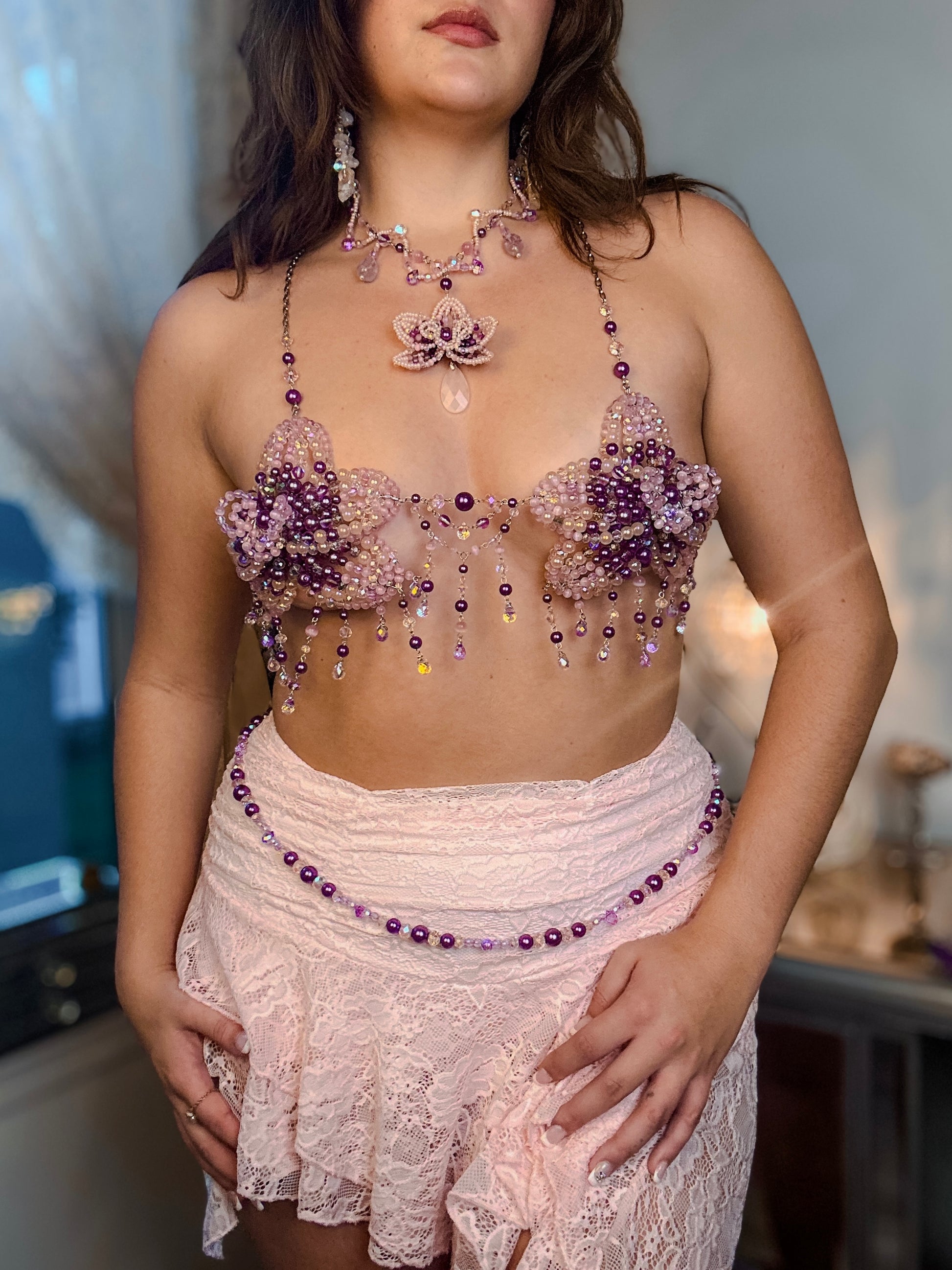 This bralette is handmade using pink cats eye, pink and purple Czech beads, and purple glass pearls. A care sheet with instructions will come with your bralette.