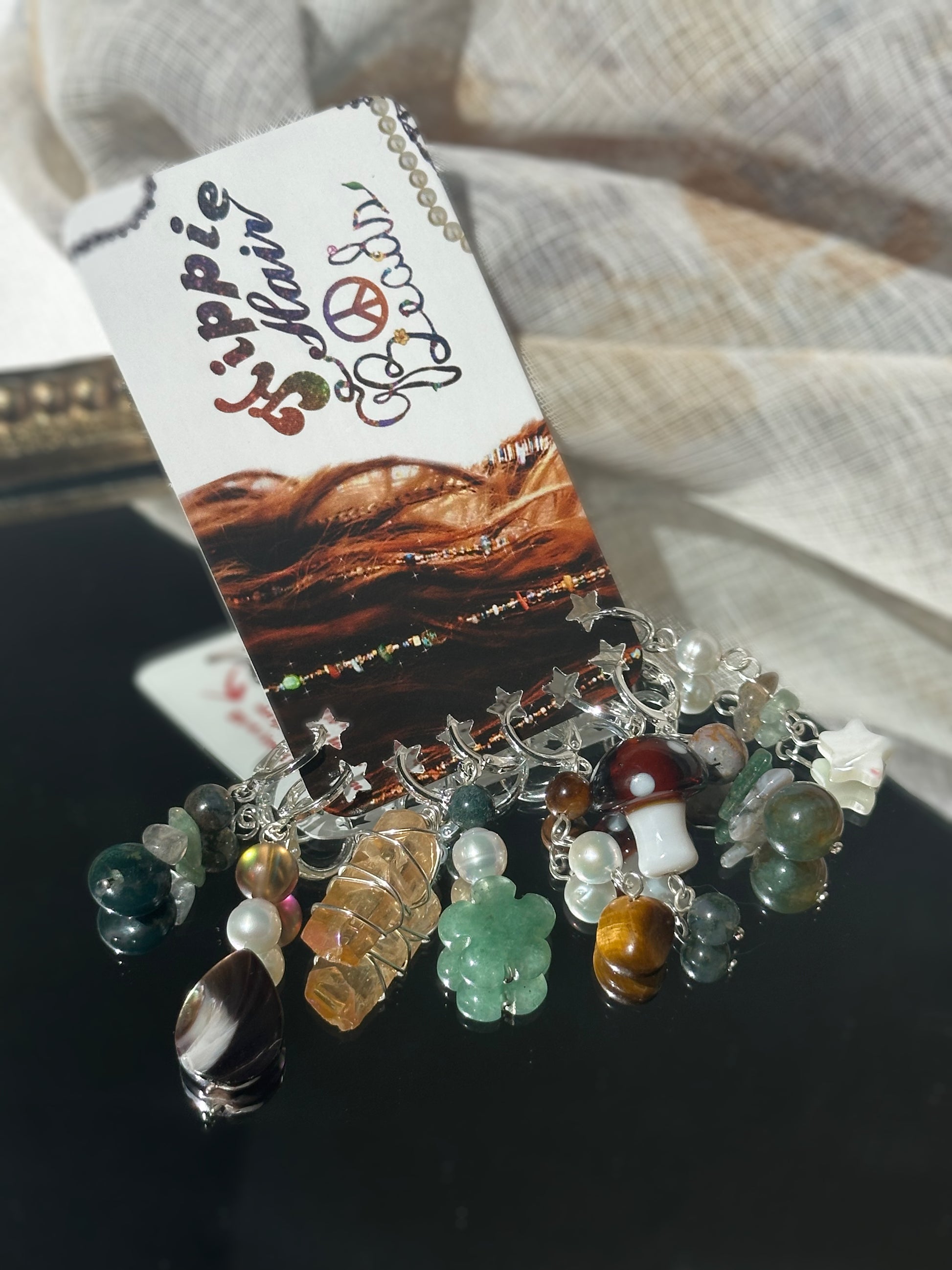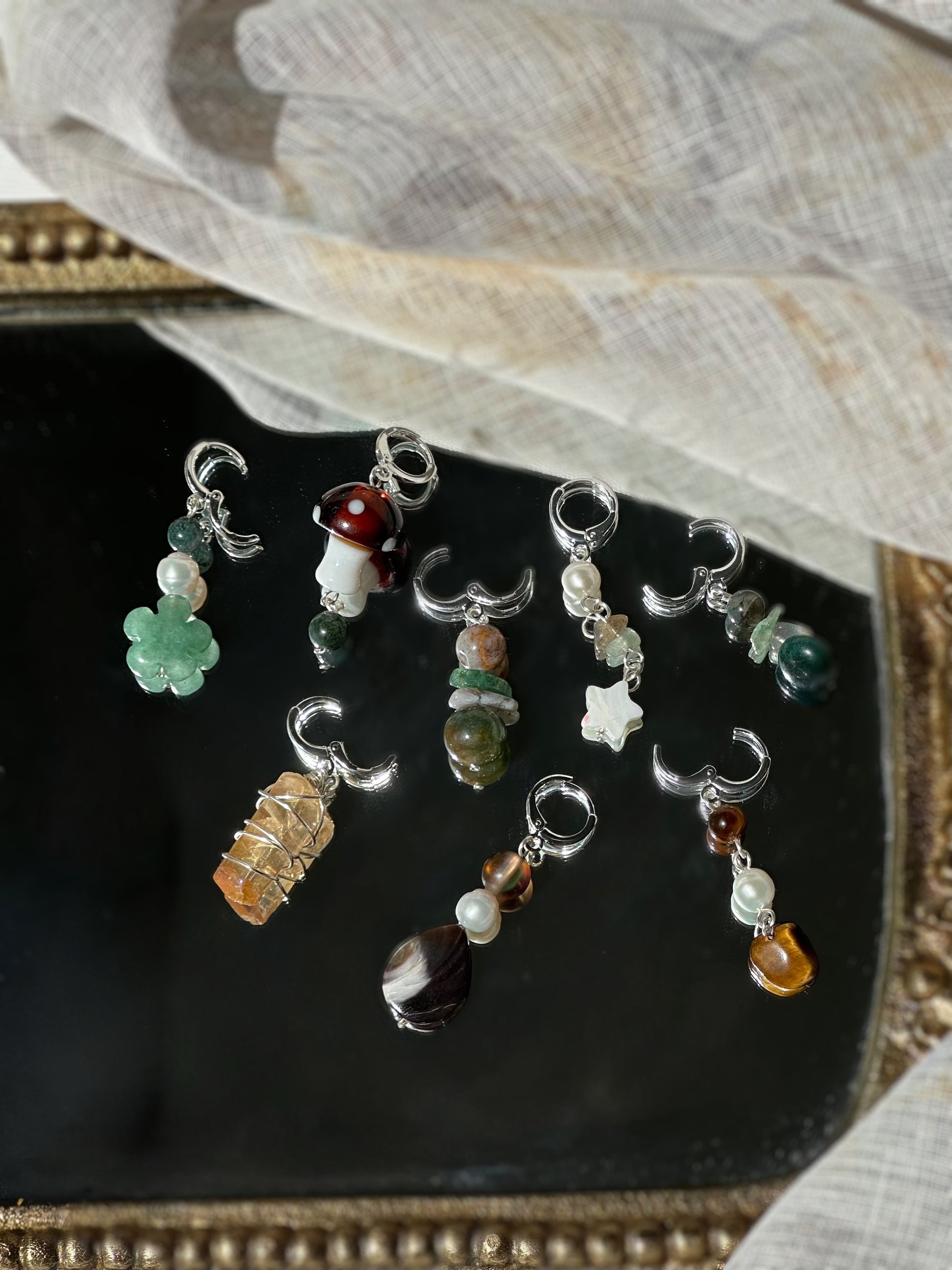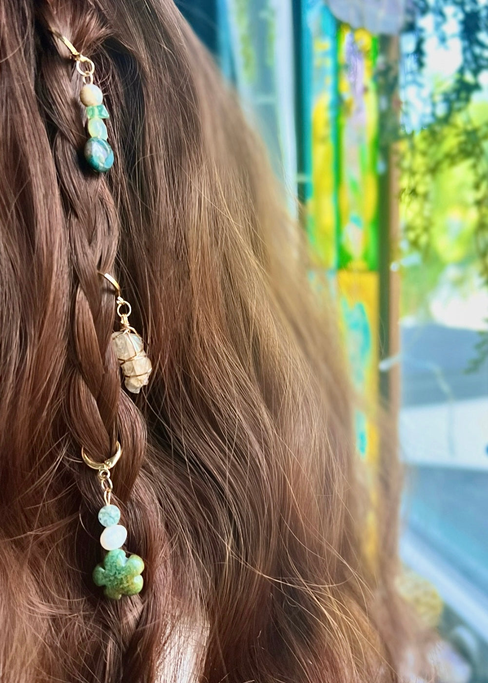 8 Hair Charms: Set with the intention of abundance and communication. They can also be worn as earrings. Clips open and shut to make applying easy!