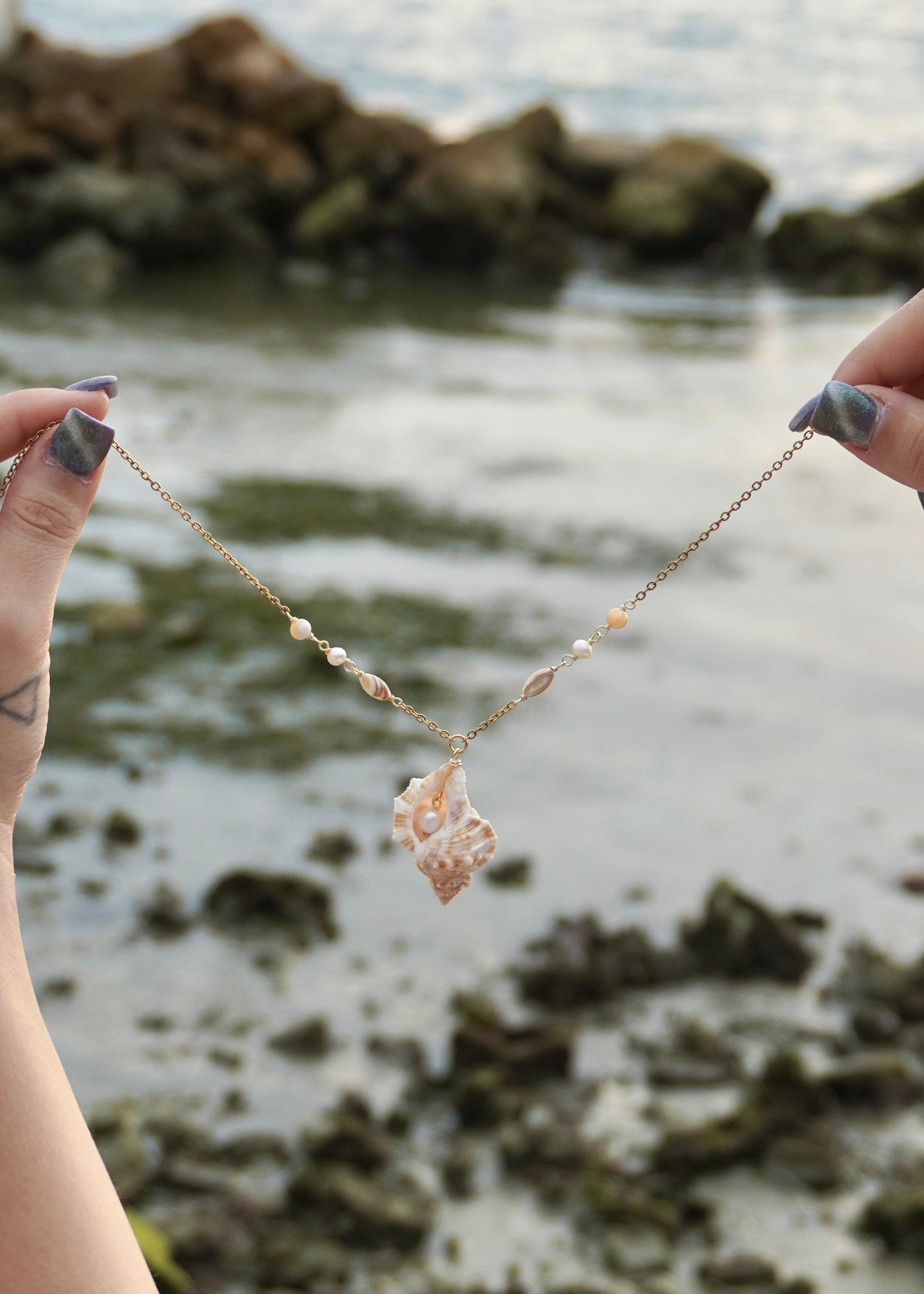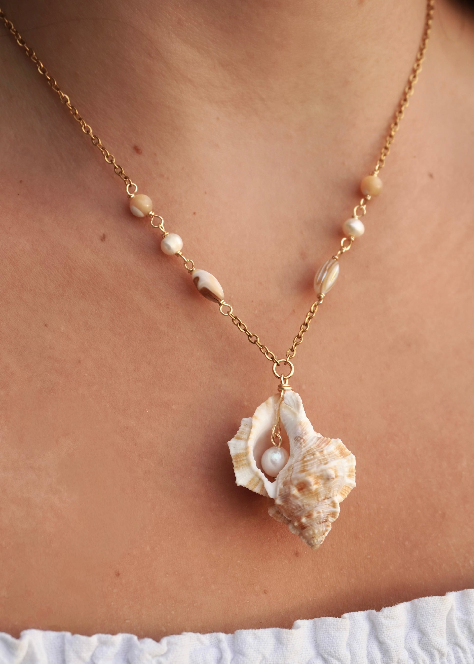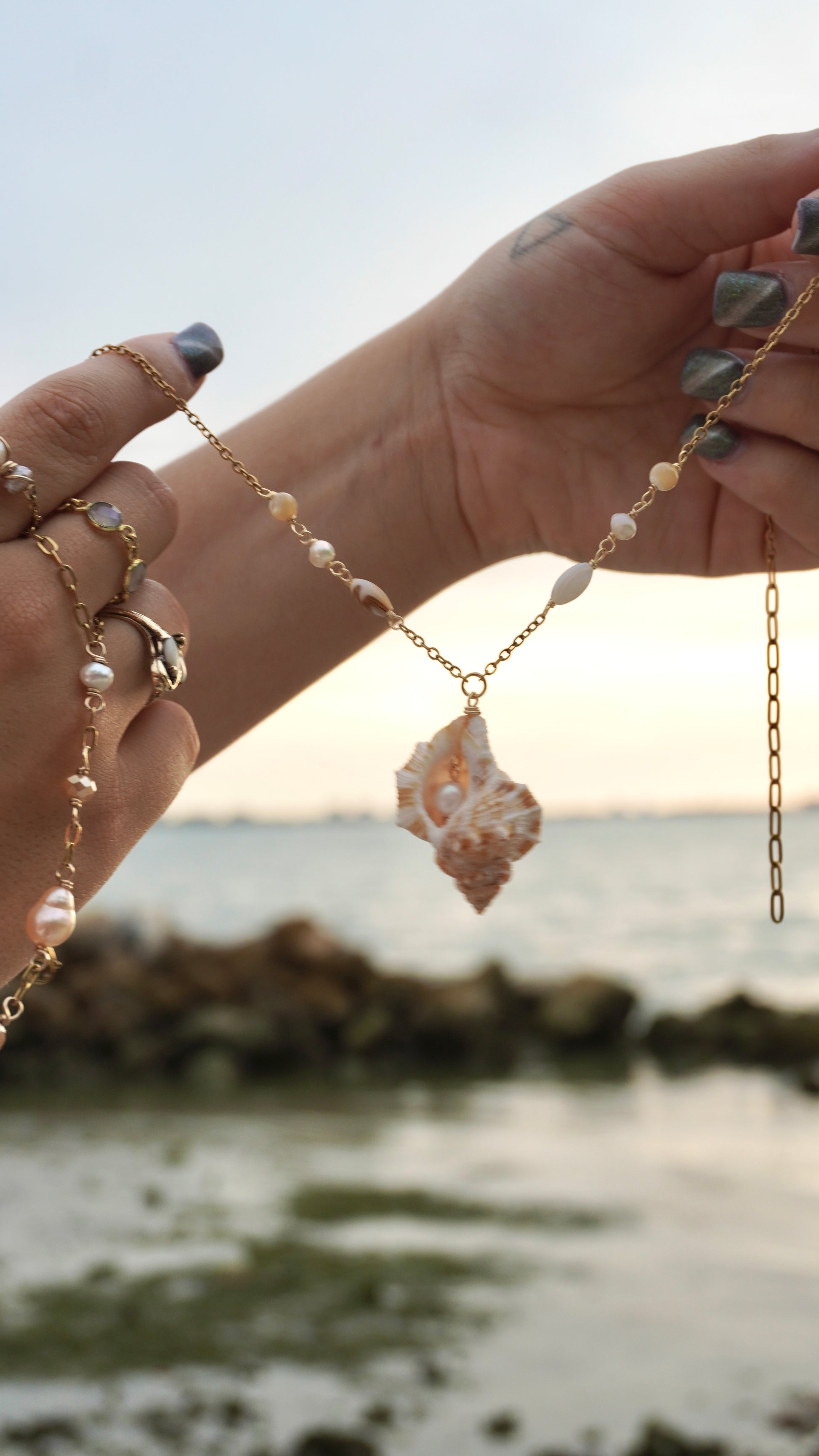 Enchanted with the intention of calm and creation. This necklace includes one large shell, Mother of Pearl, and pearl. Wrapped with Gold Vermeil or Sterling Silver wire.