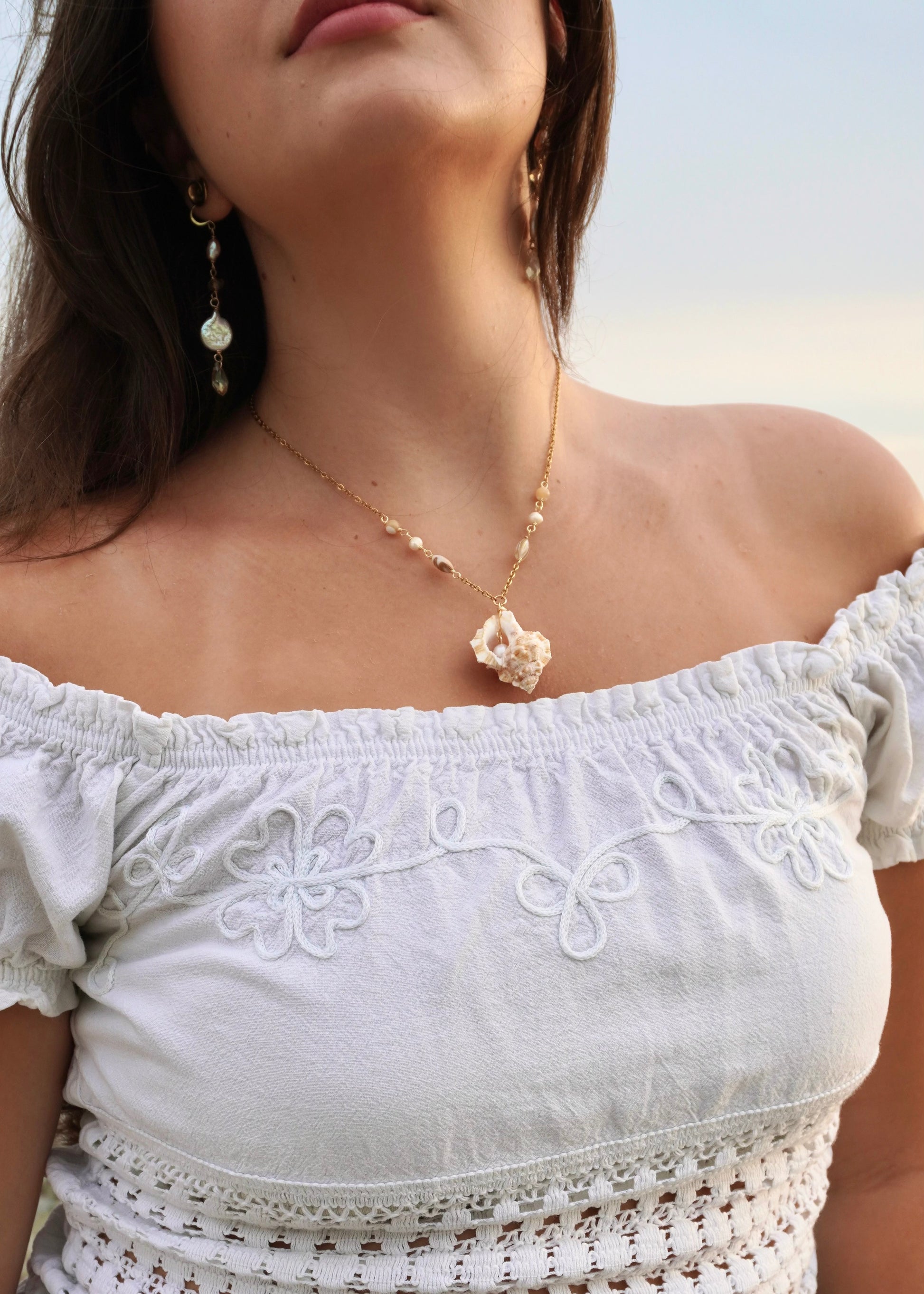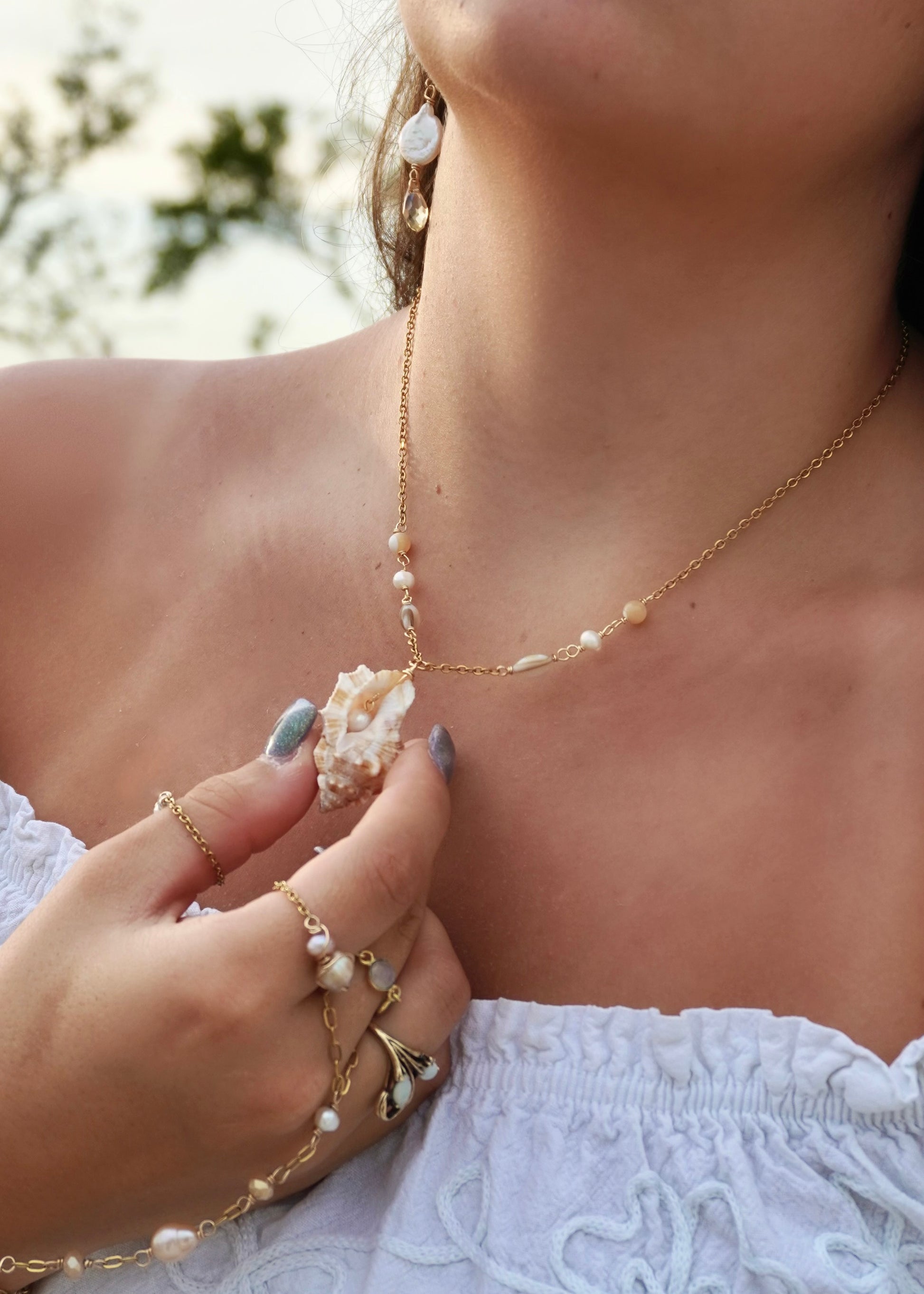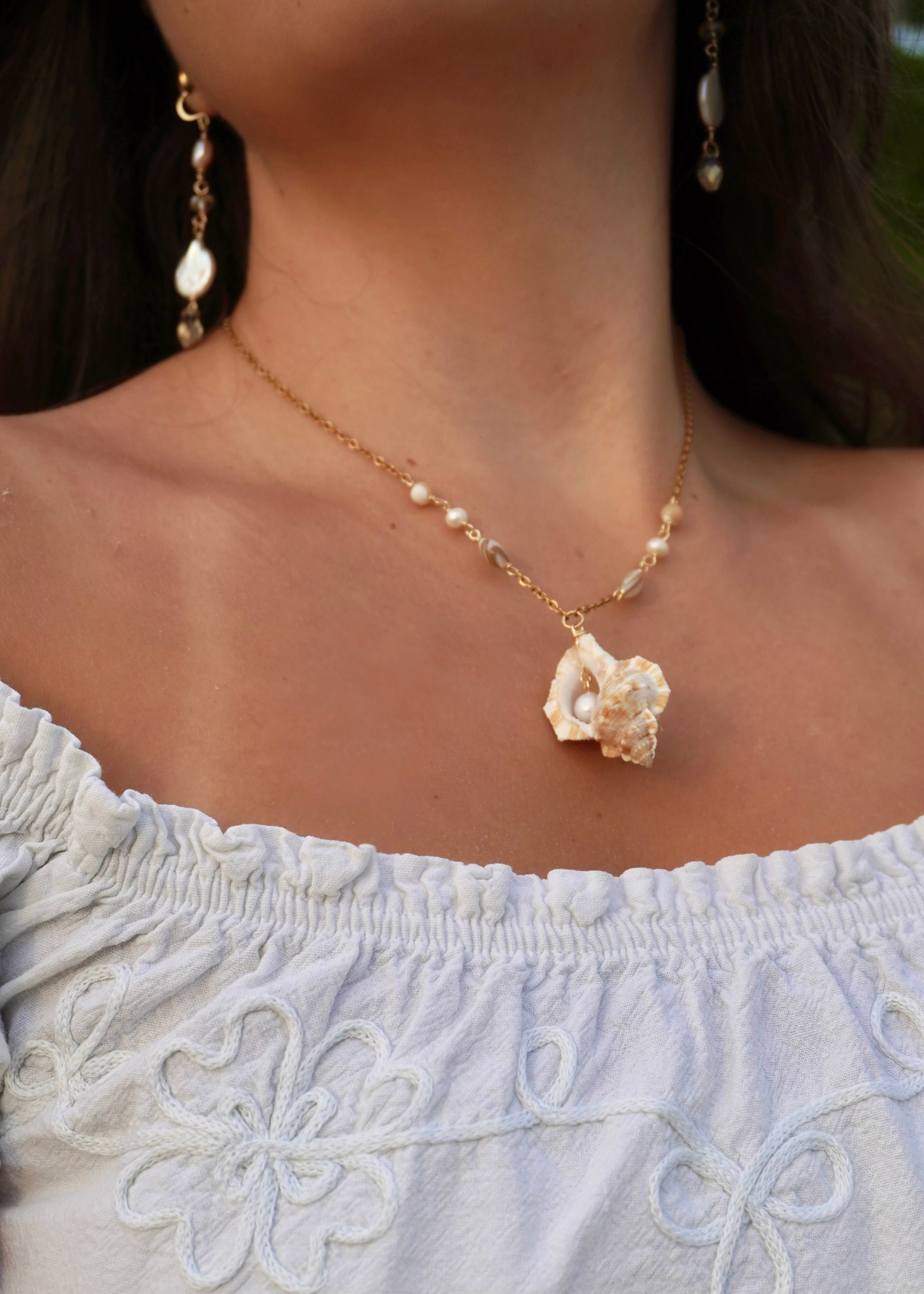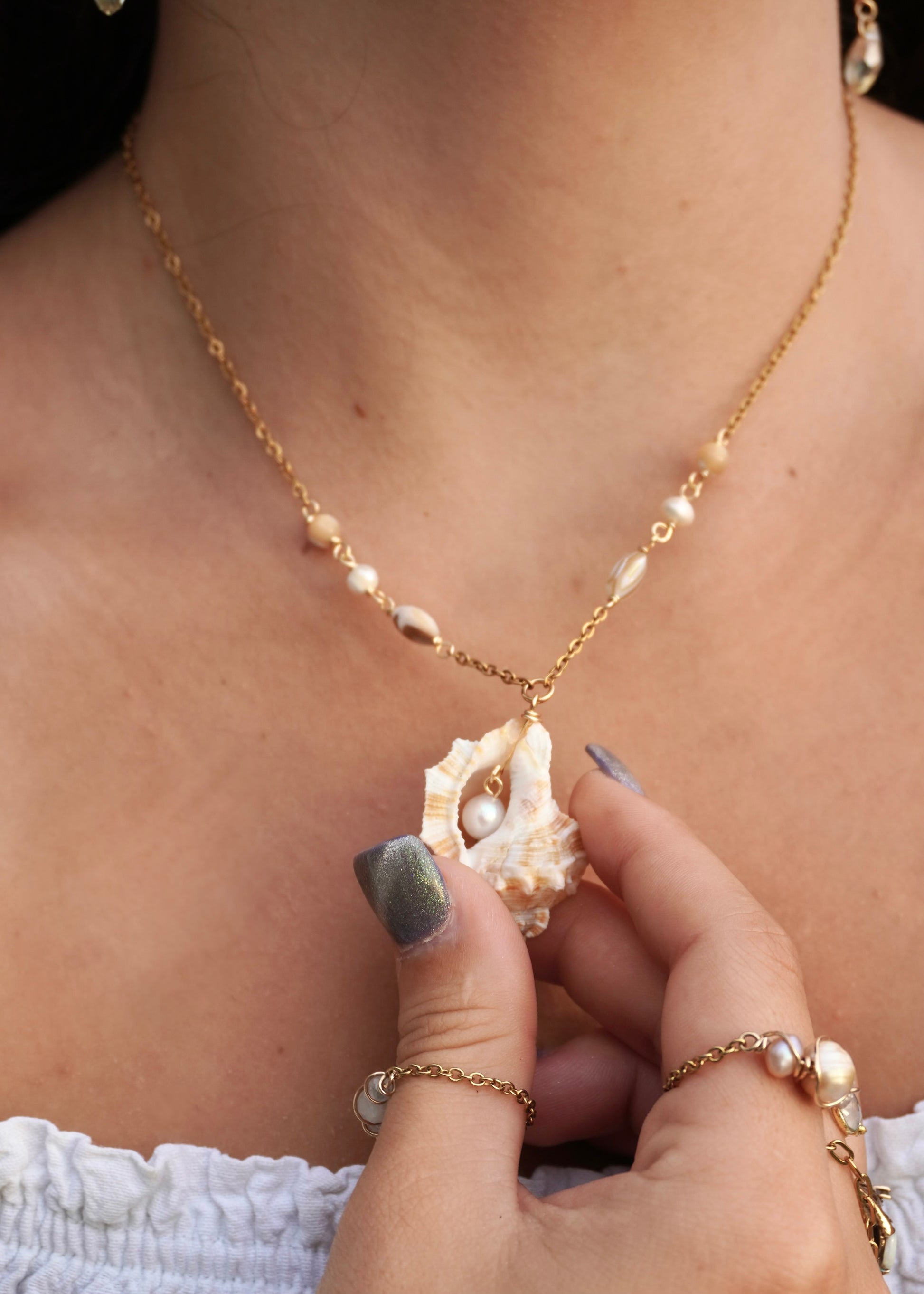 Enchanted with the intention of calm and creation. This necklace includes one large shell, Mother of Pearl, and pearl. Wrapped with Gold Vermeil or Sterling Silver wire.