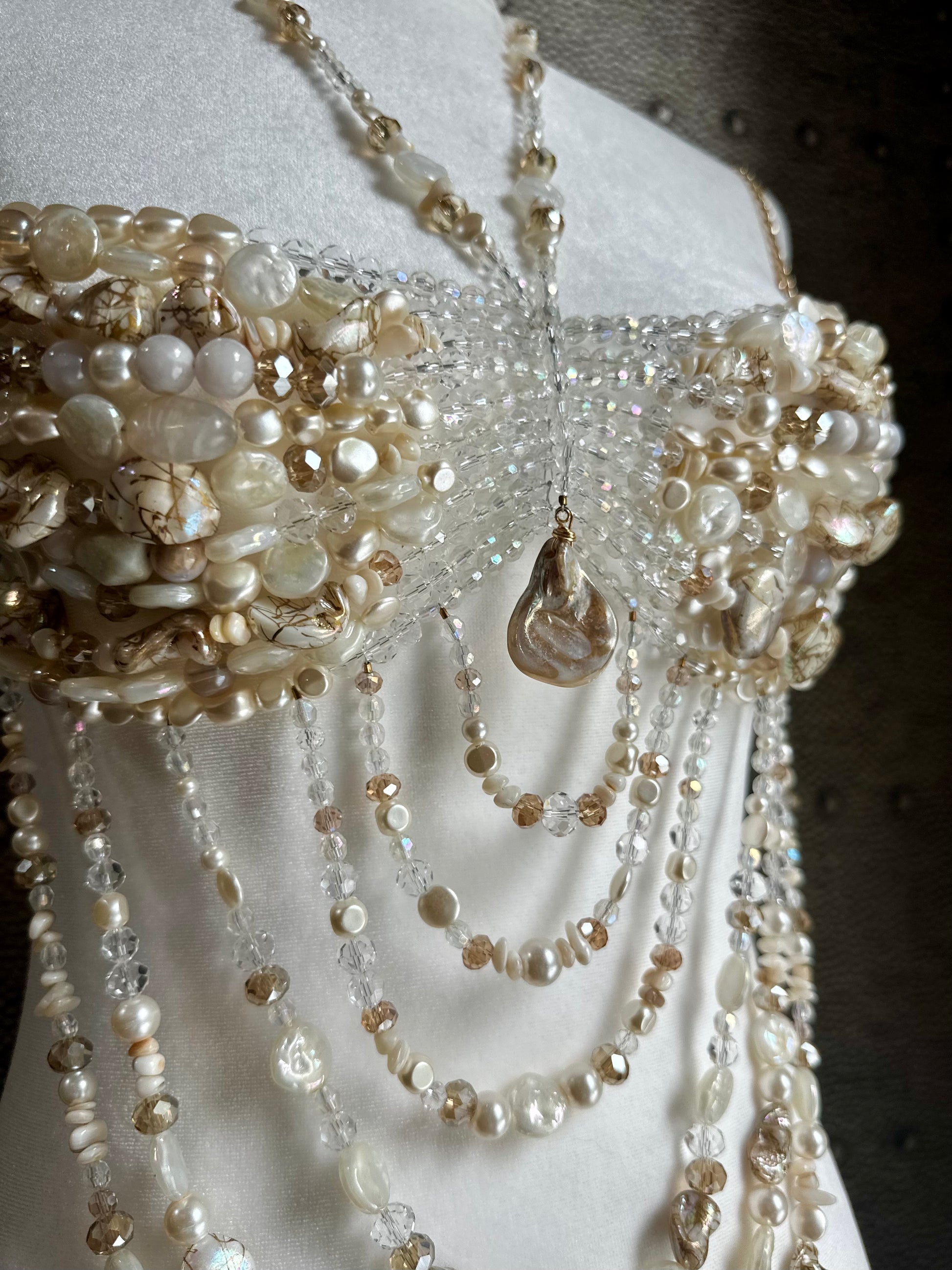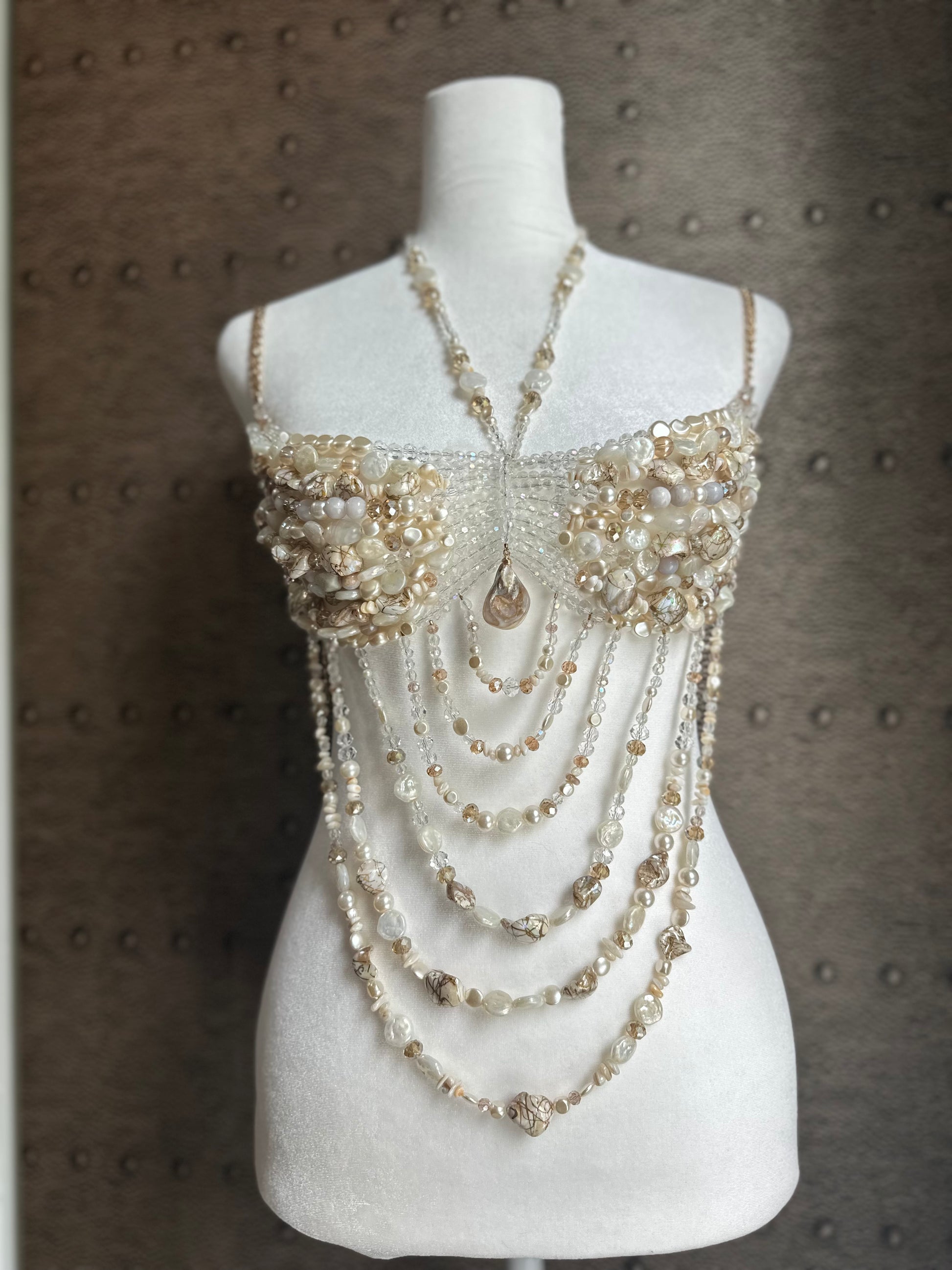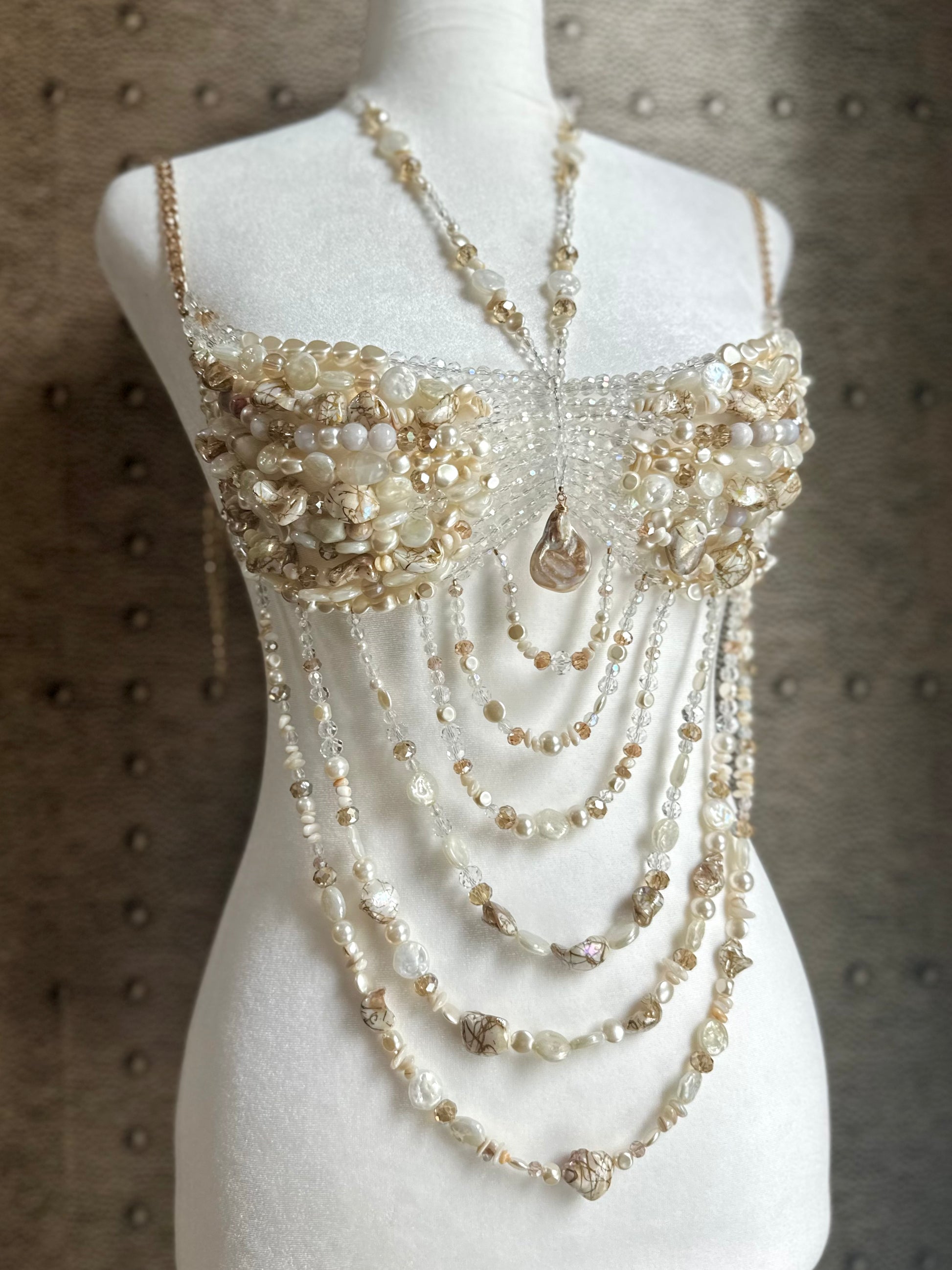 The Pearlescent beaded bra is handmade using fresh water pearls, mother of pearl, Swarovski crystals, and flat coin pearls. A care sheet with instructions will come with your bralette.