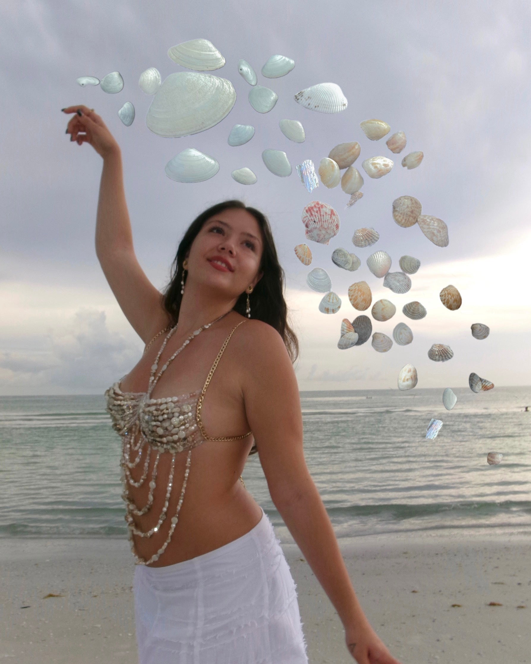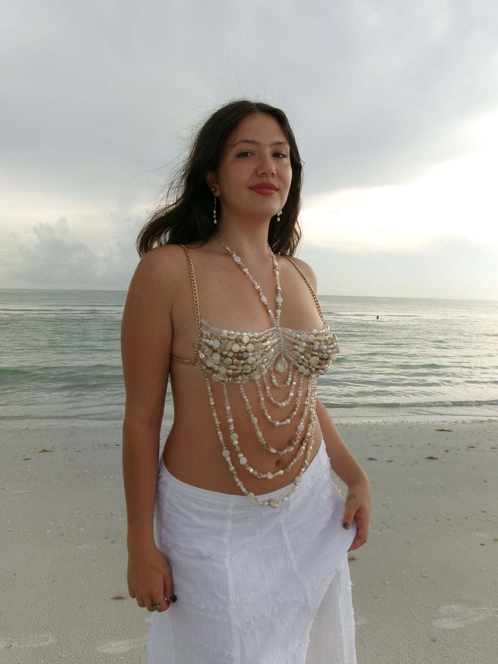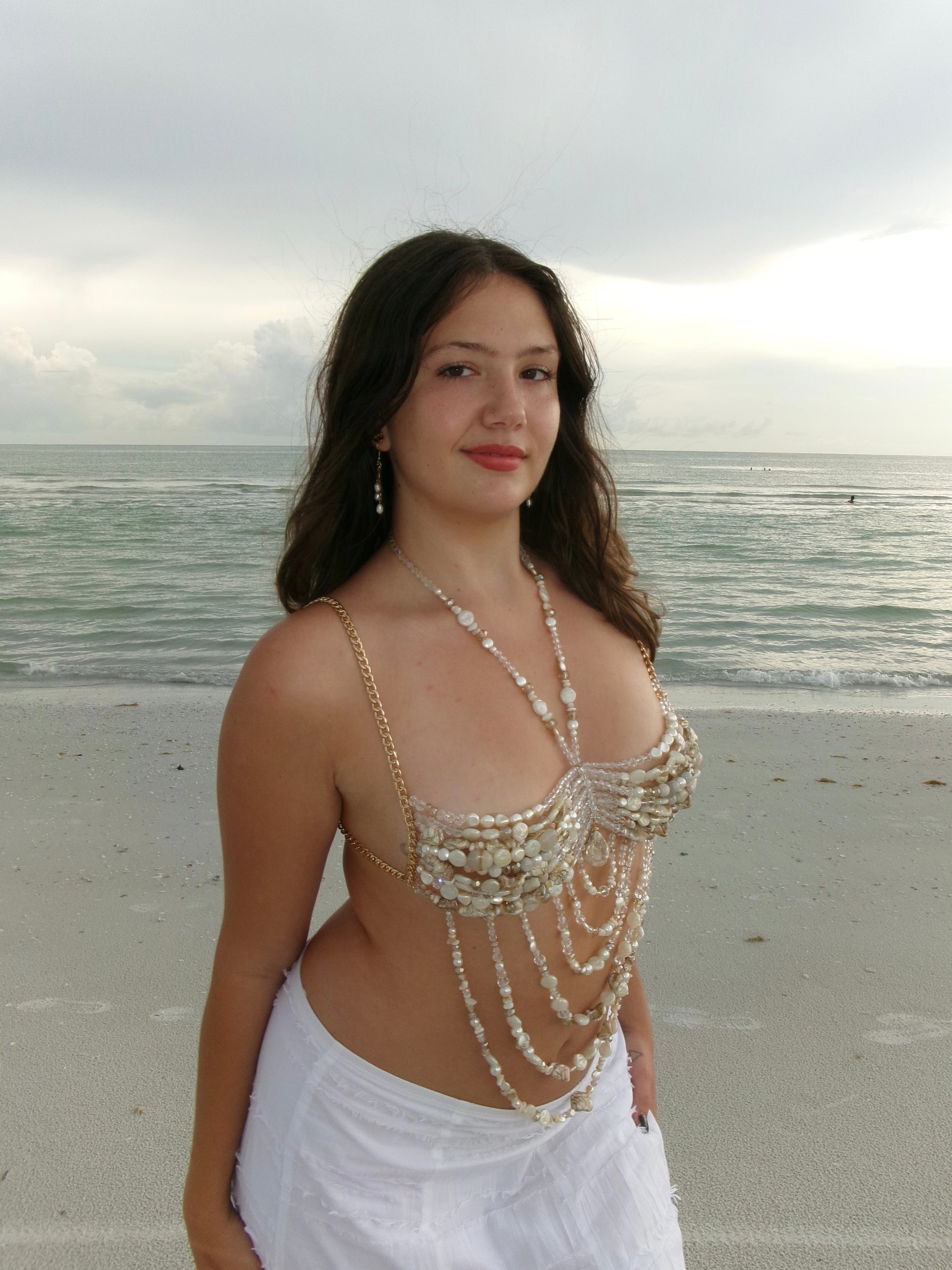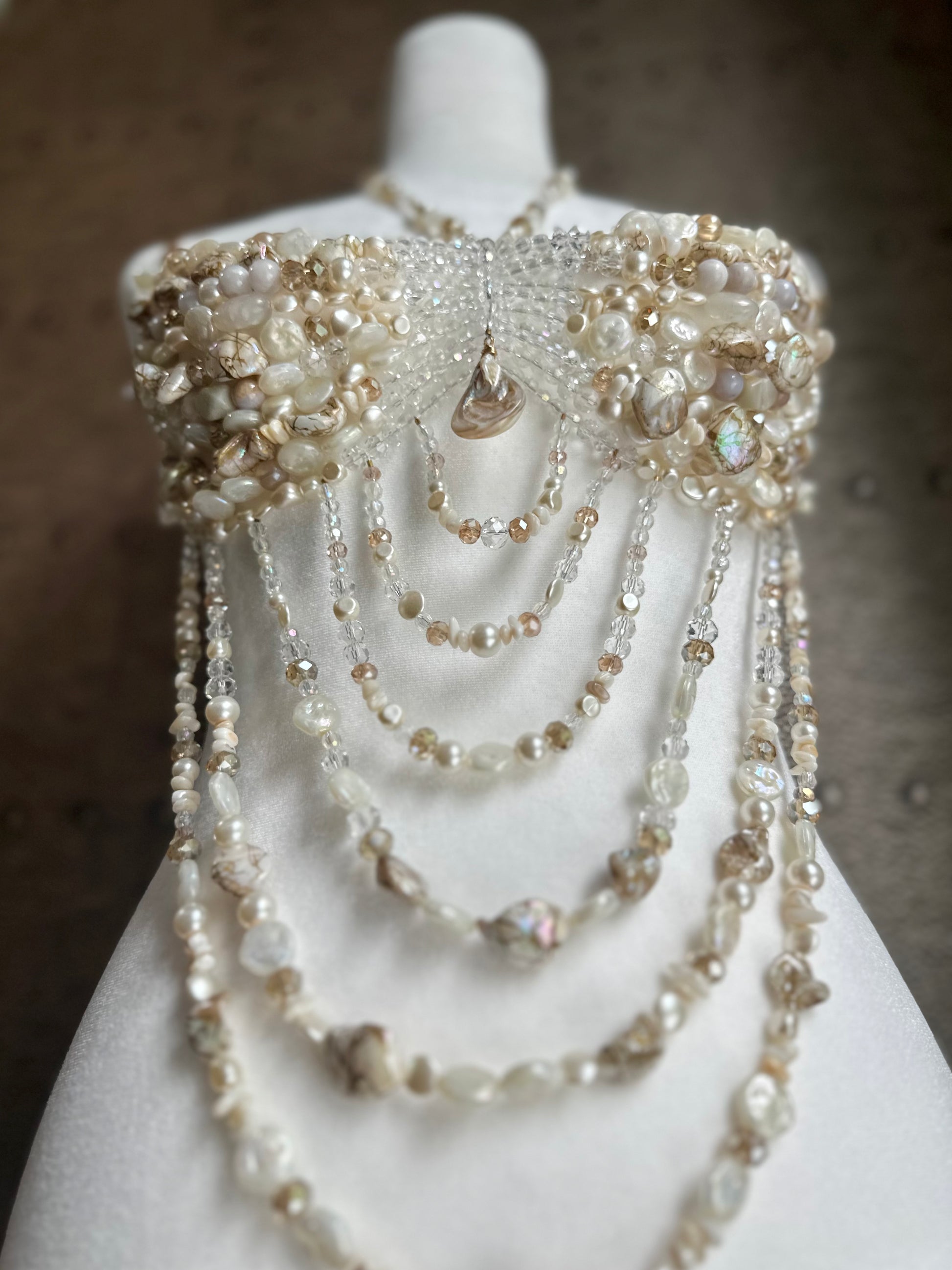 The Pearlescent beaded bra is handmade using fresh water pearls, mother of pearl, Swarovski crystals, and flat coin pearls. A care sheet with instructions will come with your bralette.