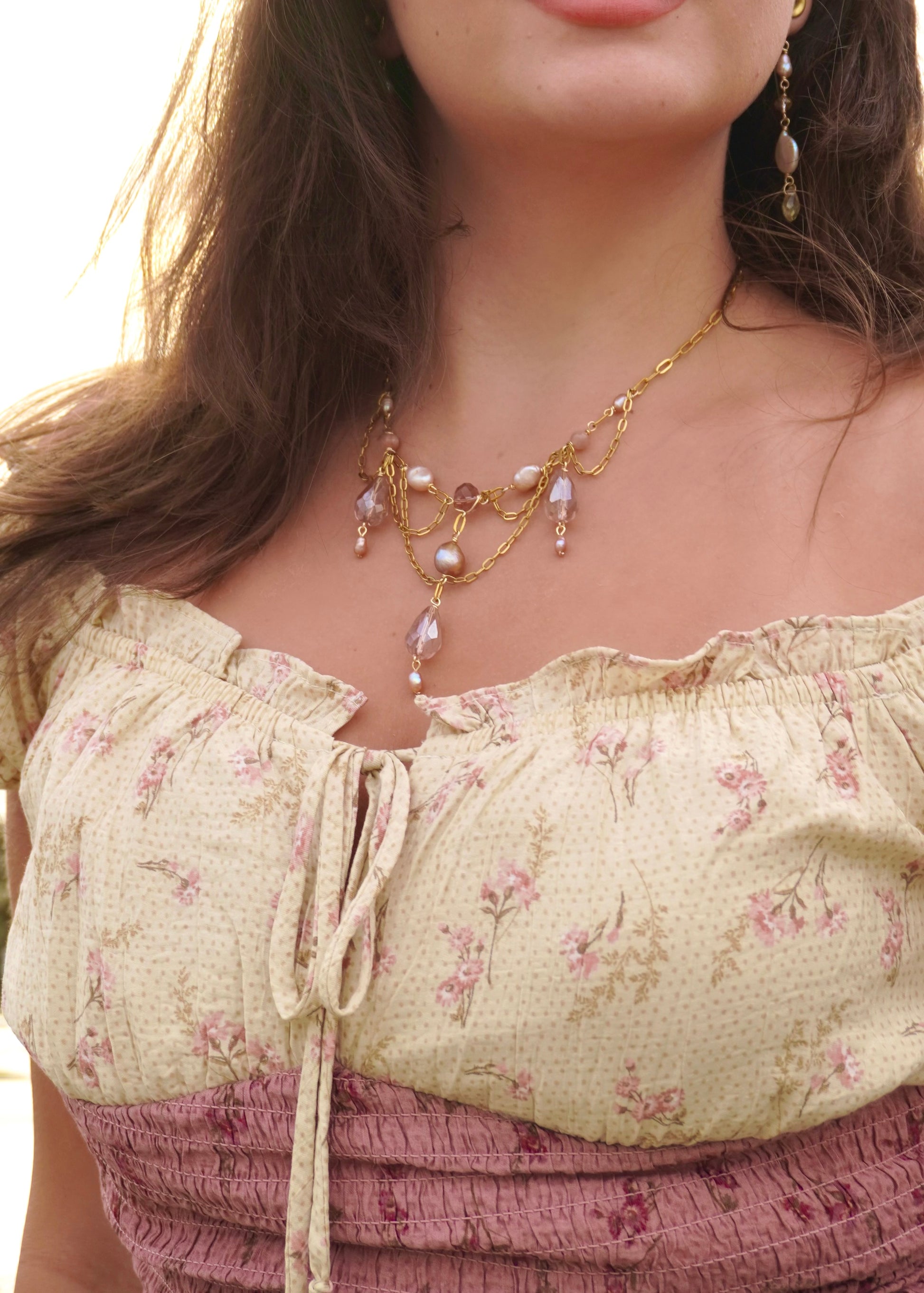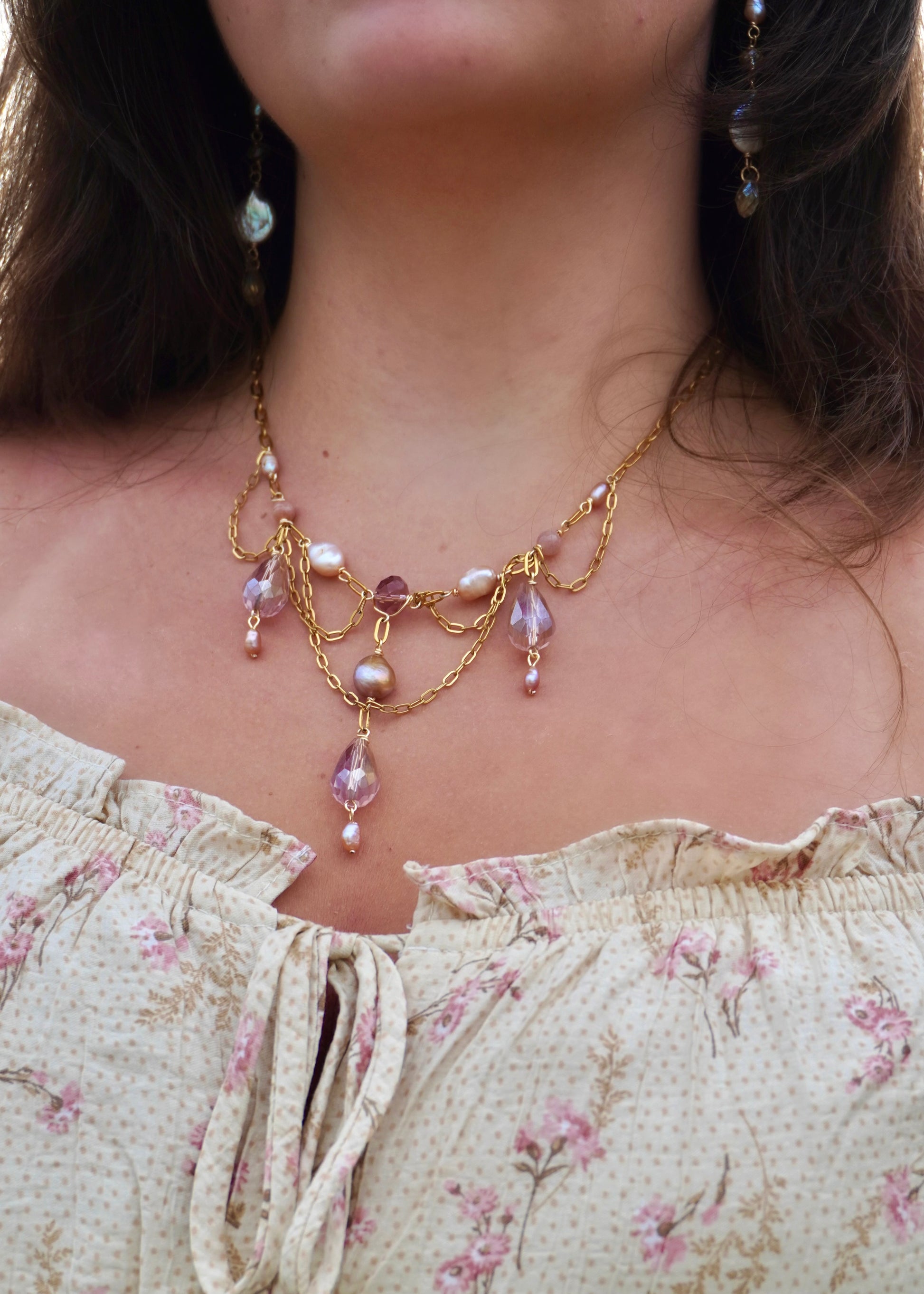 Enchanted with the intention of perseverance and acceptance. The this includes teardrop Czech beads and purple freshwater pearls. Wrapped with 14k Gold Filled wire.